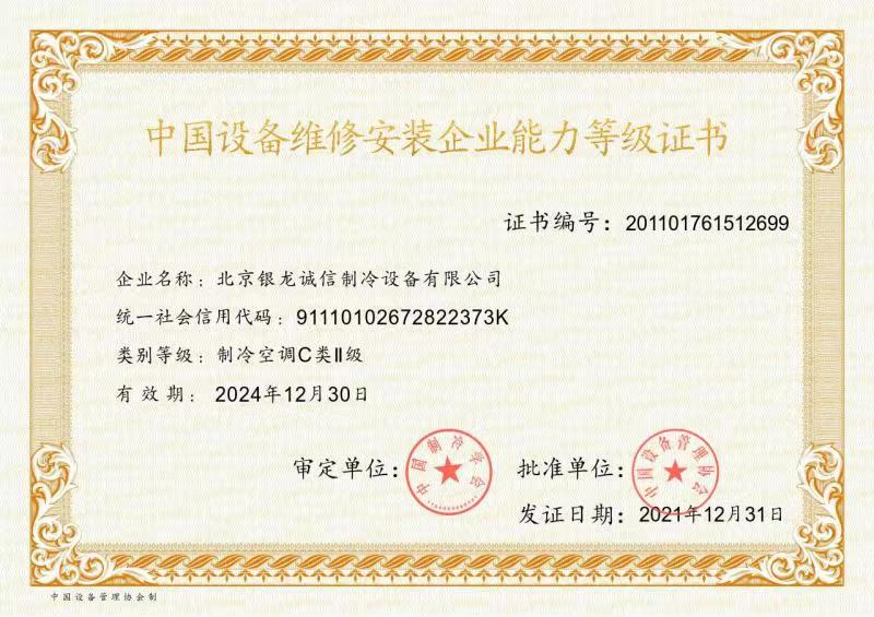 2007年:獲準(zhǔn)成為北京市制冷行業(yè)技術(shù)學(xué)會理事單位; 2009年:獲得北京市大興區(qū)百強(qiáng)企業(yè)認(rèn)證; 2009年:獲得國家高新技術(shù)企業(yè)認(rèn)證; 2011年:獲北京市安全生產(chǎn)先進(jìn)企業(yè)稱號,節(jié)能環(huán)保先進(jìn)單位; 2012年:通過了國家高新技術(shù)企業(yè)復(fù)審; 2013年:公司董事長獲"2013北京先進(jìn)企業(yè)家"榮譽稱號; 2014年:獲2014年度中國冷庫工程安裝設(shè)計造價行業(yè)十大品牌;